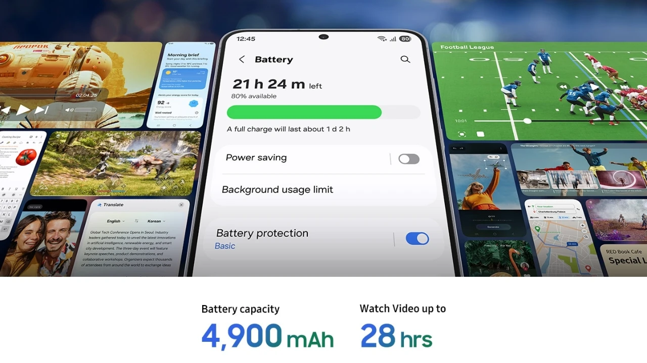 Galaxy S25 FE được trang bị viên pin dung lượng 4.900 mAh, cho thời gian phát video liên tục lên đến 28 giờ. Dung lượng pin lớn kết hợp khả năng tối ưu năng lượng từ chip Exynos 2400 giúp thiết bị duy trì hiệu suất ổn định trong suốt ngày dài. Công nghệ sạc nhanh có dây cho phép nạp khoảng 65% pin chỉ trong 30 phút, giúp thiết bị nhanh chóng sẵn sàng cho các hoạt động tiếp theo.