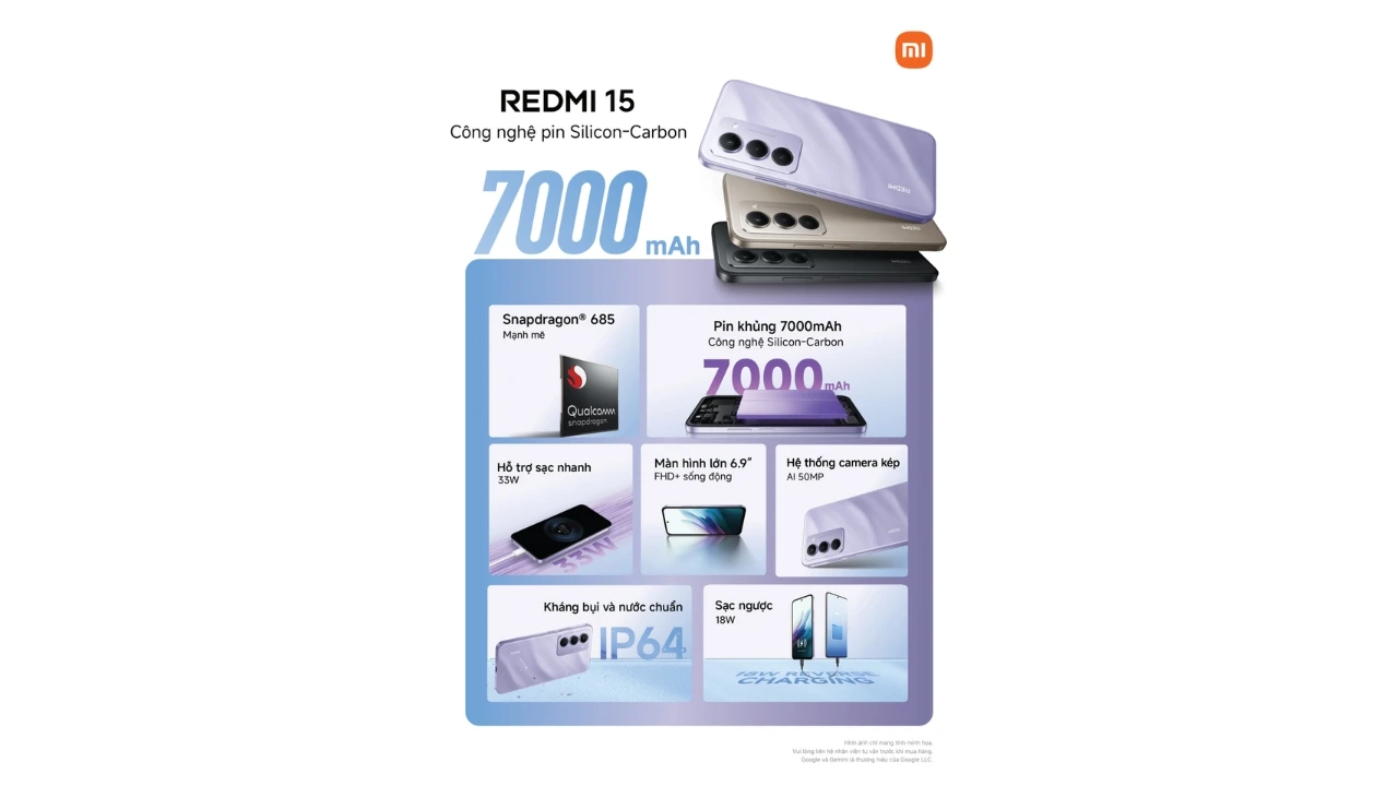Điểm nổi bật nhất trên Redmi 15 chính là viên pin dung lượng khủng lên tới 7000mAh, lớn nhất trong phân khúc smartphone phổ thông hiện nay. Viên pin này được phát triển dựa trên công nghệ tiên tiến Silicon-Carbon, giúp tăng khả năng lưu trữ năng lượng, cải thiện độ bền và tối ưu hiệu suất sử dụng lâu dài. Chỉ với một lần sạc đầy, người dùng có thể sử dụng Redmi 15 liên tục trong 2 ngày. Thậm chí, chỉ cần 1% pin, thiết bị vẫn duy trì được 64 phút đàm thoại liên tục, một con số vượt xa chuẩn pin thông thường.