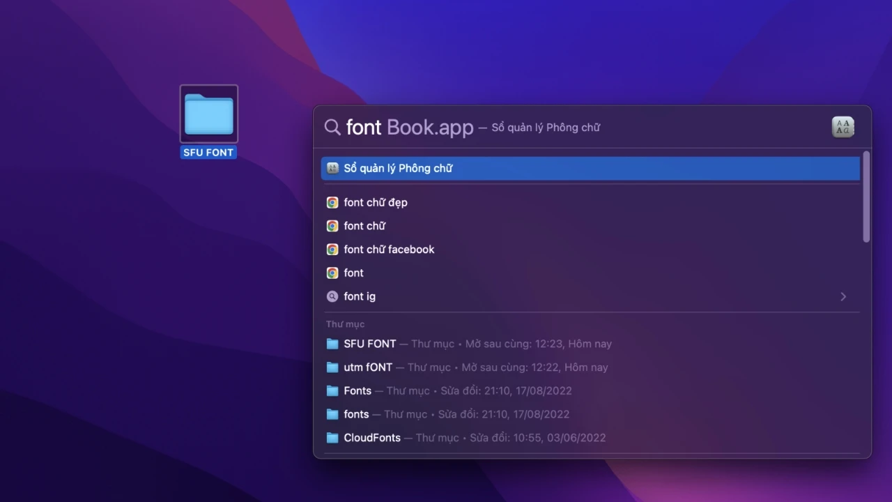 Nhấn tổ hợp Command + Dấu cách (⌘ + Space) để mở Spotlight Search, nhập từ khóa Font Book (hoặc Sổ quản lý phông chữ nếu dùng giao diện tiếng Việt), rồi mở ứng dụng này lên.