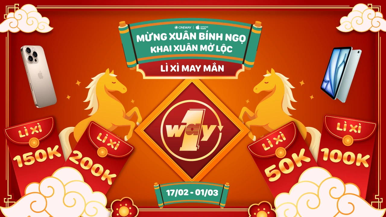 Xuân Bính Ngọ gõ cửa mang theo không khí rộn ràng, khởi đầu cho một năm mới hanh thông và nhiều may mắn. Hòa chung nhịp mua sắm đầu năm, Oneway chính thức triển khai chương trình “Mừng xuân Bính Ngọ - Nhận lì xì to” với ưu đãi giảm giá lên tới 7 triệu đồng/sản phẩm, cùng hoạt động mở lì xì đầu năm đầy hứng khởi. Đây là thời điểm lý tưởng để Khách hàng nâng cấp thiết bị công nghệ, đón lộc xuân và khởi động năm mới trọn vẹn.