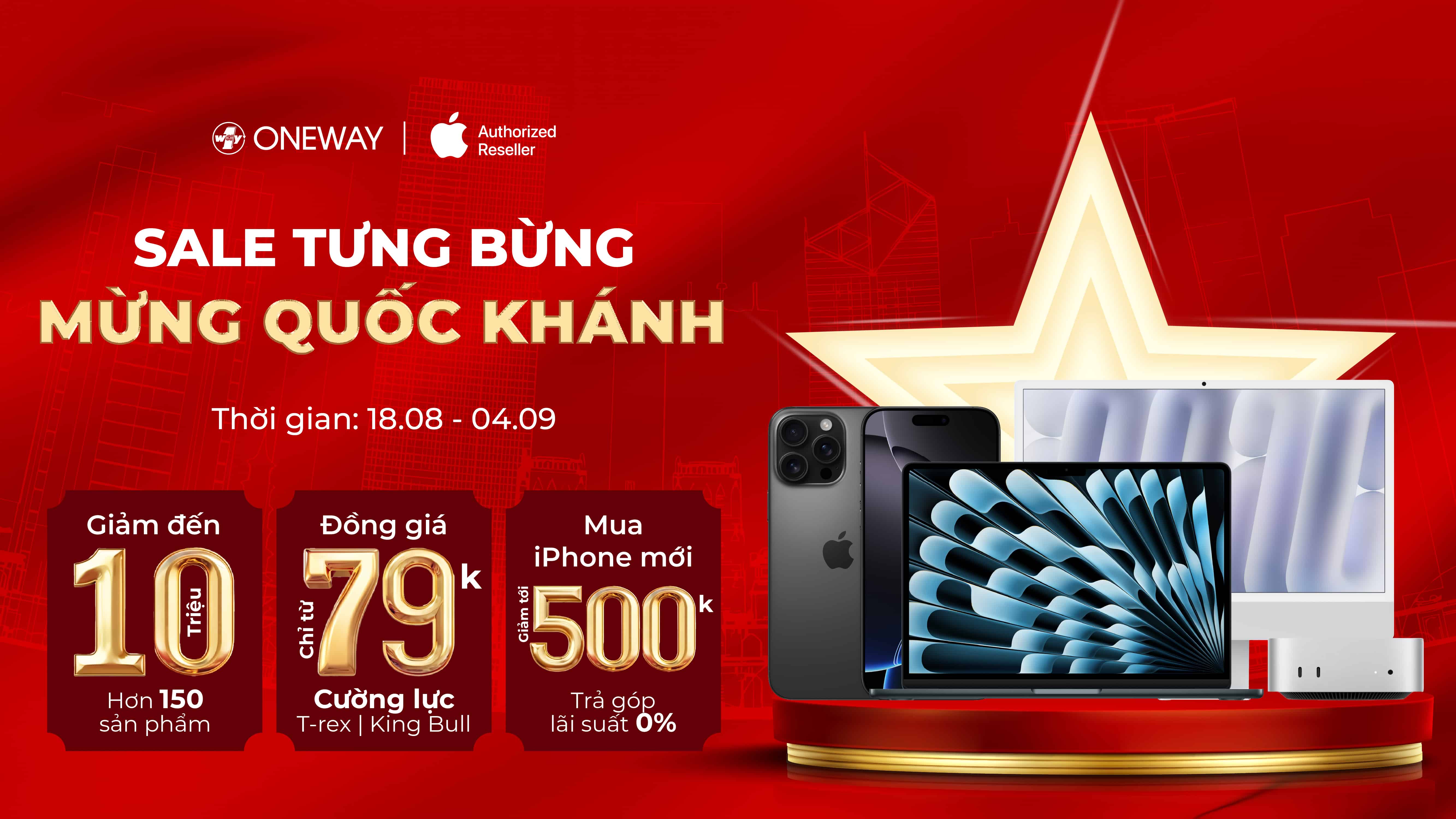 Kỷ niệm 80 năm ngày Quốc khánh 2/9, Oneway khuấy động mùa lễ lớn với chương trình “SALE TƯNG BỪNG - MỪNG QUỐC KHÁNH”. Hơn 150 sản phẩm công nghệ từ điện thoại, máy tính bảng, MacBook tới phụ kiện đổ bộ ưu đãi, giảm sâu tới 10 triệu đồng. Không khí Quốc Khánh rộn ràng, deal hời ngập tràn đây chính là cơ hội hiếm có để nâng cấp thiết bị yêu thích, chỉ diễn ra từ 18/08 đến 04/09/2025.